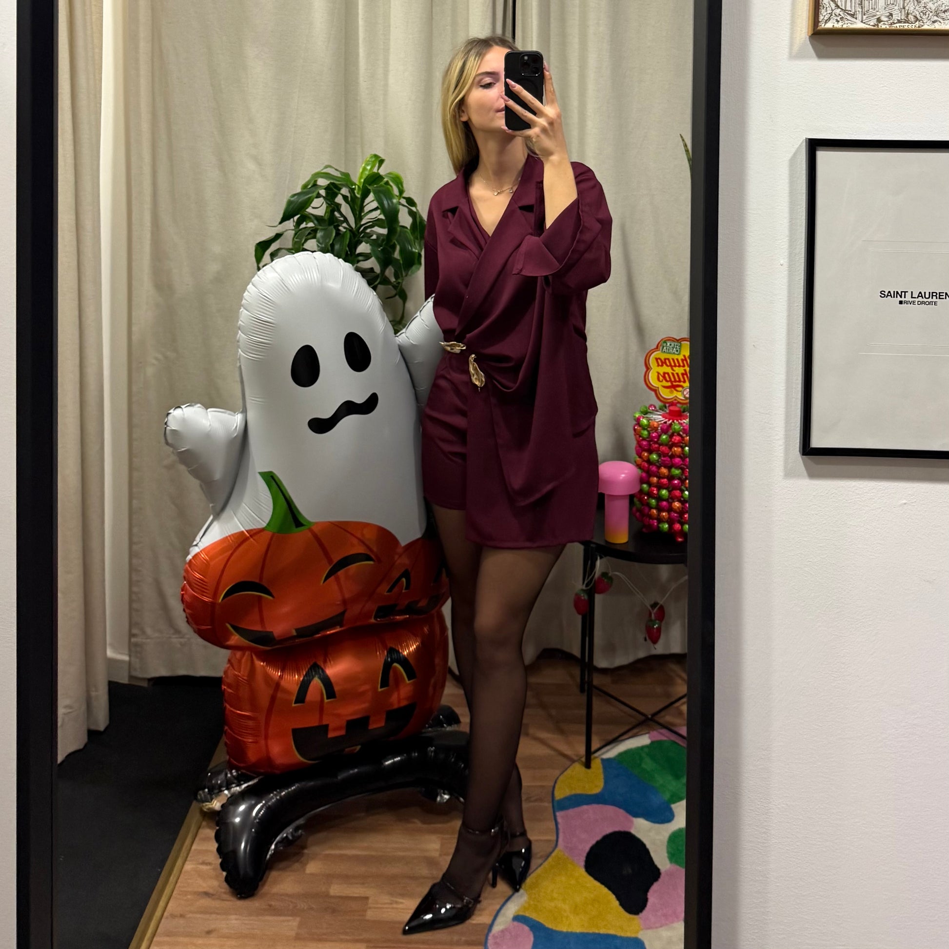 Il design presenta un colletto stile blazer e un taglio incrociato che crea un effetto blazer-dress moderno e molto chic. La cintura gioiello in vita illumina il look e definisce la silhouette, mentre la lunghezza mini dona un tocco femminile e sensuale.