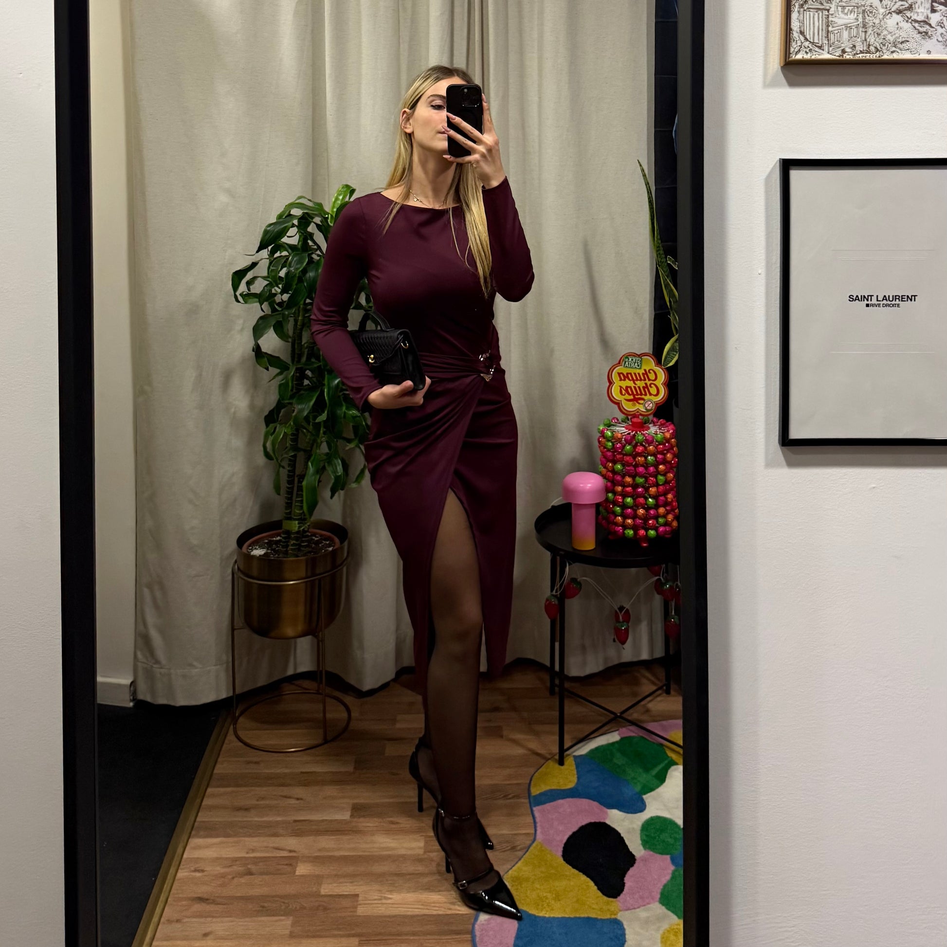 Abito elegante in tonalità vinaccia/borgogna, realizzato in tessuto elasticizzato che avvolge la silhouette con classe e comfort.